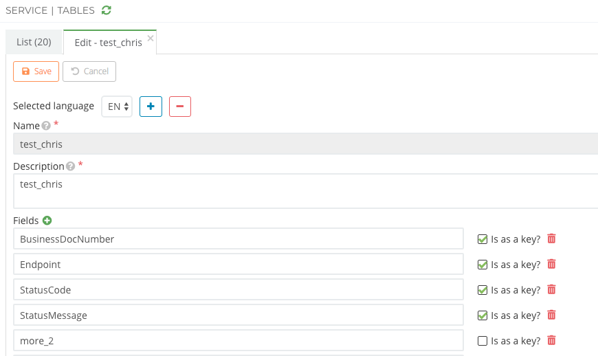 The table’s name and the English description are mandatory and cannot be empty. You must also provide at least one key field.