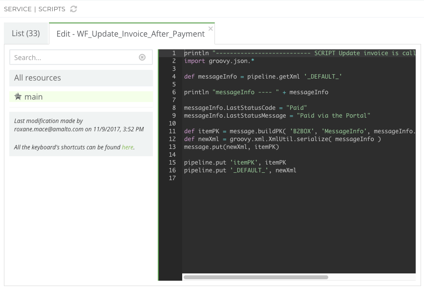A resource consists of a name, a type (Groovy, XML, HTML, XSLT, TEXT, TypeScript) and a content. By clicking on a resource’s name, you display the content in the code editor.