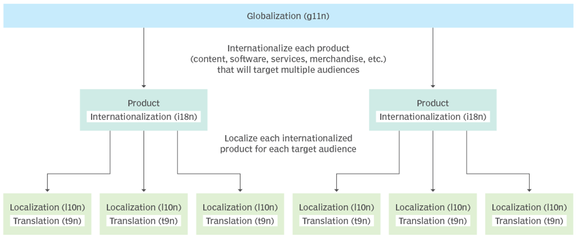 Globalization(g11n). to extend its reach beyond the confines of a specific region, culture or language.Internationalization(i18n). The process of designing and building a product so it is indifferent to any specific culture or language.Localization(l10n). The process of adapting and customizing a product for a specific target audience, as identified by its language and culture. Localization includes translating text as well as ensuring that the UI, text and images are formatted and presented in a way that is acceptable to the target audience.Translation(t9n). The process of translating all readable text into the language of the target audience. Translation is a key step in the localization process, but it is not the only step.